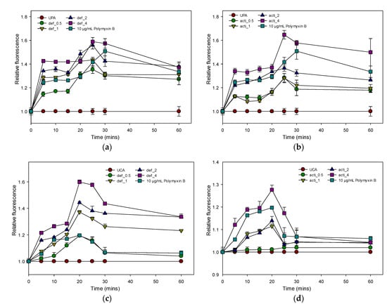 The outer-membrane permeabilizations of MDR P. aeruginosa and C. albicans were determined by using the fluorescent dye 1-N-phenylnapthylamine (NPN) uptake assay. As shown in Figure 11, defensin-d2 and actifensin rapidly permeabilized the outer membranes of P. aeruginosa and C. albicans in a concentration-dependent manner, as observed by the increase in the NPN fluorescence. The peptides were able to permeabilize the outer membranes of both organisms, and especially P. aeruginosa, even at 0.5× the MICs for both peptides. The increase in the fluorescence observed at 2× and 4× the MICs of both recombinant peptides was higher than that of the 10 µg/mL polymyxin B.