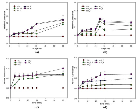 Relative fluorescence of NPN uptake to assess outer-membrane permeability of recombinant defensin-d2 and actifensin against P. aeruginosa and C. albicans. (a) defensin-treated P. aeruginosa (b) actifensin-treated P. aeruginosa (c) defensin-treated C. albicans (d) actifensin-treated C. albicans. Untreated samples were used for normalization. UPA—untreated P. aeruginosa; UCA—untreated C. albicans; def—defensin-d2; acti—actifensin. Graphs show means and standard error means (as error bars) of triplicate data per treatment.