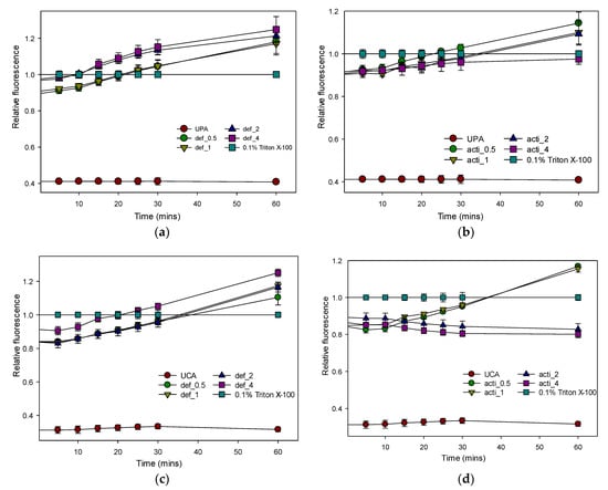 Relative fluorescence of 3-DiSc (5) uptake to assess inner-membrane depolarization of recombinant defensin-d2 and actifensin against P. aeruginosa and C. albicans. (a) defensin-treated P. aeruginosa (b) actifensin-treated P. aeruginosa (c) defensin-treated C. albicans (d) actifensin-treated C. albicans. The positive control, 0.1% (v/v) Triton-X 100, was used for normalization of fluorescence. UPA—untreated P. aeruginosa; UCA—untreated C. albicans; def—defensin-d2; acti—actifensin. Graphs show means and standard error means (as error bars) of triplicate data per treatment.