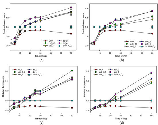 Relative fluorescence of H2DCFDA for assessing ROS production in P. aeruginosa and C. albicans treated with recombinant defensin-d2 and actifensin. (a) defensin-treated P. aeruginosa (b) actifensin-treated P. aeruginosa (c) defensin-treated C. albicans (d) actifensin-treated C. albicans. The positive control, 2mM H2O2, was used for normalization of fluorescence. UPA—untreated P. aeruginosa; UCA—untreated C. albicans; def—defensin-d2; acti—actifensin. Graphs show means and standard error means (as error bars) of triplicate data per treatment.