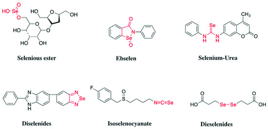 The selenium (Se) has been recognized to play an important role in human health and disease [7,8]. In recent years, a number of studies have indicated an inverse association between Se intake and cancer risk [9,10,11]. There are three main categories of Se-containing compounds (inorganic, organic, and selenoproteins) with potential pharmacological properties; the most developed and studied are organoselenium compounds, which have been shown to inhibit the initiation and postinitiation phases of chemical carcinogenesis [12]. Organic selenium compounds with diverse functional groups, including selenoesters, methylseleninic acid, isoselenocyanates, diselenides, endocyclic selenium, selenocyanates and trifluoromethyl selenides, were found to show potent antiproliferative activity [13,14,15,16,17,18] (Figure 1).
