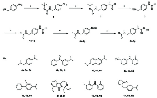 The synthesis of novel families of NSAIDs-based seleno derivatives as potential antiproliferative agents: Isoselenocyanates (ISCs) (5a–5h) and selenoureas (6a–6h) in this study was performed as outlined in Scheme 1.