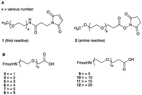 (A) Examples of common PEGylating reagents. (B) Structure of commercially available PEGs containing an acetyl handle (3–8) or a propionyl handle (9–12); n = number of ethylene glycol units.