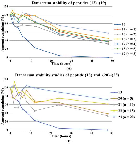 Detected levels (RP-HPLC) of A20FMDV2 (13) and PEGylated analogues (14–19), with ethylene glycol units attached via an acetyl handle (A) and propionyl handle (B), that remained over a period of 48 h in rat serum at 37 °C; n = number of ethylene glycol units in the PEG chain. Data expressed as percentage of peptide remaining over a period of 48 h.