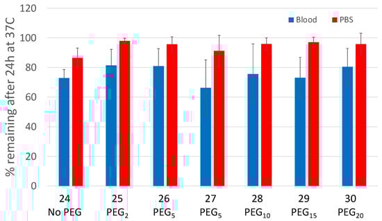The [111In]-DTPA-A20FMDV2 control 24 and the corresponding PEGylated analogues [111In]-DTPA-NH-(CH2-CH2-O)n-CH2-[2Lys(d-biotin)]A20FMDV2 (n = 2, 5, 25 and 26, respectively), and [111In]-DTPA-NH-(CH2-CH2-O)n-CH2-CH2-[2Lys(d-biotin)]A20FMDV2 (n = 5, 10, 15, and 20) 27–30, respectively) were incubated in either human plasma or phosphate-buffered saline (PBS) at 37 °C for 24 h, and the samples were analysed using RP-HPLC, with the results reported as the percentage of peptide remaining after 24 h (Figure 3).