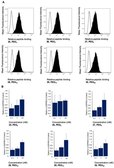 2.3. Specificity and Affinity Evaluation for A375Ppuroβ6 and A375Ppuro Cells of DTPA-[2Lys(d-biotin)]A20FMDV2 (24) and DTPA PEGylated-[2Lys(d-biotin)]A20FMDV2 Analogues (25–30) Using Flow Cytometry