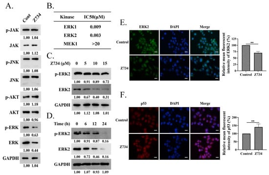 Z734 downregulates the expression of ERK2 in MCF–7 cells. (A) MCF–7 cells were treated with Z734 (10 μM for 12 h). The expression levels of p–JAK, JAK, p–JNK, JNK, p–AKT, AKT, p–ERK, ERK, and GAPDH were determined via Western blotting. (B) Effects of Z734 on kinase activity of ERK1, ERK2, and MEK1. (C) Western blot analysis of the p–ERK2 and ERK2 expressions in MCF–7 cells exposed to 0, 5, 10, and 15 μM of Z734 for 12 h. Relative protein expression was normalized to GAPDH. (D) Western blot analysis of the p–ERK2 and ERK2 expressions in MCF–7 cells treated with Z734 (10 μM) for 0, 6, 12, and 24 h. (E,F) MCF–7 cells were exposed to Z734 (10 μM) for 12 h and were then stained with antibodies for ERK2 and p53. DAPI was used to stain the nuclei. Images were obtained using a fluorescence microscope. Quantification of fluorescence was performed on the average optical density using the ImageJ software. Scale bars = 10 μm. Data shown in (E,F) were used two–tailed Student’s t–test. All assays were performed in triplicate, and the data are expressed as mean ± standard deviation. ** p < 0.01.
