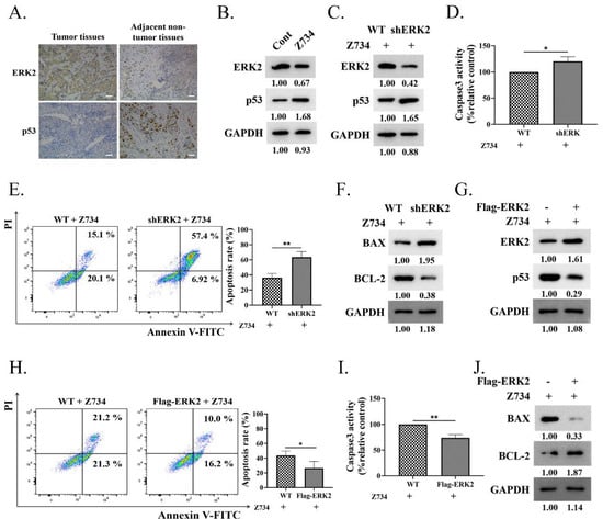 ERK2 inhibition promotes Z734–mediated apoptosis in MCF–7 cells. (A) ERK2 and p53 exhibit various levels of expression in tissues and in adjacent non–tumor tissues. Scale bars = 50 μm. (B) The ERK2 and p53 expression levels were determined via Western blotting after treatment with Z734 (10 μM). (C) Western blots were performed to determine the effect of ERK2 knockdown on p53 expression in MCF–7 cells after treatment with Z734 (10 μM). (D) Caspase3 activities in shERK2 MCF–7 cells treated with Z734 (10 μM) were determined. (E) WT and shERK2 MCF–7 cells were treated with Z734 (10 μM) for 12 h followed by flow cytometry to detect cell apoptosis. (F) Western blots were performed to detect the effect of ERK2 knockdown on BAX/BCL–2 expression in MCF–7 cells after treatment with Z734 (10 μM). (G) Western blots were performed to detect the effect of Flag–ERK2 on p53 expression in MCF–7 cells after treatment with Z734 (10 μM). (H) MCF–7 cells were transfected with Flag–ERK2 and treated with Z734 (10 μM) for 12 h followed by flow cytometry to detect cell apoptosis. (I) Caspase3 activities in ERK2 overexpressing MCF–7 cells treated with Z734 (10 μM) were determined. (J) Western blots were performed to detect the effect of overexpressing ERK2 on BAX/BCL–2 expression in MCF–7 cells after treatment with Z734 (10 μM). Data shown in (D,E,H,I) were used two–tailed Student’s t–test. All assays were performed in triplicate, and the data are expressed as mean ± standard deviation. * p < 0.05, ** p < 0.01.
