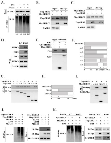 HERC3 interacts with ERK2 and promotes in the Z734–mediated ubiquitination of ERK2. (A) MCF–7 cells were treated with MG132 (10 mM) and Z734 (10 μM) for 12 h. (B) Total lysates from MCF–7 cells expressing Myc–HERC3 in the presence of Flag–ERK2 were subjected to immunoprecipitation (IP) with anti–Myc followed by Western blotting using the indicated antibodies. (C) Total lysates from MCF–7 cells expressing Flag–ERK2 in the presence of Myc–HERC3 were subjected to IP with anti–Flag followed by Western blotting using the indicated antibodies. (D) The interaction between endogenous ERK2 and HERC3 was analyzed via co–immunoprecipitation. IP samples and whole–cell lysates were analyzed via Western blotting. IgG served as the negative control. (E) The indicated purified GST–HERC3 protein was mixed with purified Flag–ERK2 protein. GST pulldown analyses were conducted. (F–I) Schematic representations of wild–type and deletion mutants of ERK2 (Figure 4F) and HERC3 (Figure 4H) are shown by describing each functional motif and numbers corresponding to the amino acid residues. The associations between various truncation mutants of ERK2 (Figure 4G) and HERC3 interaction–defective mutants (Figure 4I) were detected using the indicated IP and IB analyses. aa, amino acids. (J) MCF–7 cells were treated with MG132 (10 mM) and Z734 (10 μM) for 12 h. (K) MCF–7 cells were transfected with Flag–ERK2, Myc–HERC3, and wild–type (WT) or mutant ubiquitin (K48O) as indicated. The poly–ubiquitination of ERK2 was examined via Western blotting using an anti–ubiquitin antibody.