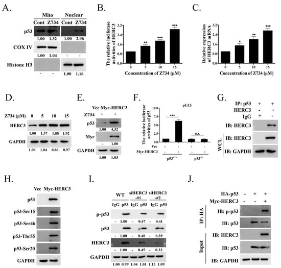 In response to cellular stress, p53 is translocated to the nucleus to bind DNA and regulates apoptosis as a major senescence and cell death inducing transcription factor, or it is induced by the direct interactions of cytoplasmic p53 with mitochondrial proteins [29,43]. We first evaluated if Z734 also regulates the subcellular localization of p53. Mitochondrial and nuclear fractions were separated and analyzed in the presence or absence of Z734. Interestingly, we observed that p53 was present in both fractions and was enhanced after treatment with Z734 (Figure 5A). In this study, we found that the activity of the luciferase reporter driven by the HERC3 promoter (HERC3–Luc) was increased by concentration–dependent Z734 (Figure 5B). Z734 exerted an effect on the mRNA and protein levels of HERC3, and the expression was clearly increased in a concentration–dependent manner (Figure 5C,D). Next, we attempted to determine if HERC3 could regulate the p53 levels. Thus, we evaluated the possible relationship between HERC3 and p53 in the presence of Z734. We found that overexpression of HERC3 led to a higher p53 expression in MCF–7 cells after treatment with Z734 (Figure 5E). Using a luciferase reporter assay, we found that compared with the pGL3 control, the activity of the luciferase reporter driven by the HERC3 promoter (HERC3–Luc) was increased, and this effect was eliminated in p53−/− MCF–7 cells (Figure 5F). Then, we attempted to determine if HERC3 interacts with p53 using Co–IP assays with MCF–7 cells, and the results confirmed a direct interaction (Figure 5G). The regulation of p53 occurs by a variety of mechanisms, including phosphorylation [44,45,46,47]. Subsequently, we investigated whether HERC3 affected p53 activity by phosphorylation. We observed that cell transfection with Myc–HERC3 can cause widespread phosphorylation in the p53 protein, including on serines 15, 46, and 20 or on threonine 55 (Figure 5H). Contrarily, HERC3 knockdown diminished the interaction of p53 with endogenous HERC3, reduced the basal levels of p53, and inhibited the phosphorylation of p53 in unstimulated MCF–7 cells (Figure 5I). To determine if p53 phosphorylation is mediated by the activity of HERC3, MCF–7 cells were transfected with HA–p53 and Myc–HERC3. As presented in Figure 5J, the levels of p–p53 were increased by overexpression of HERC3 in MCF–7 cells. Collectively, these results provide convincing evidence that HERC3 is involved in the phosphorylation at p53, thereby increasing cell apoptosis.