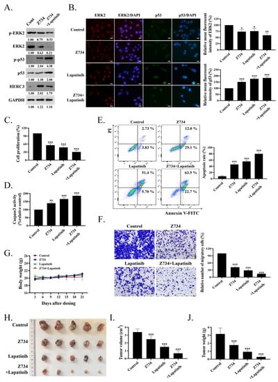 Lapatinib is an oral dual tyrosine kinase inhibitor that selectively inhibits epidermal growth factor receptor/human epidermal growth factor receptor–2 (EGFR/HER2) [48]. In this study, the cells were treated with Z734 and lapatinib to determine if they could exert synergistic effects on breast cancer cells. Cotreatment with lapatinib can further repress both the ERK2 and p–ERK2 levels when compared with the control or Z734 groups (Figure 6A). The combination of Z734 and lapatinib also significantly increased the p53 and p–p53 levels. Although the addition of lapatinib did not enhance the expression of HERC3 compared with Z734 alone, the results indicated that lapatinib potentiated the action of Z734, resulting in enhanced cytotoxic efficacy. We conducted immunofluorescence analyses and ELISAs to further study the effects of Z734 and lapatinib. Figure 6B presents the expression levels of ERK2 and p53 in Z734–treated MCF–7 cells via fluorescence microscopy, and these results are consistent with the Western blot data presented in Figure 6A. We observed a decrease in cell viability with combination therapy (Z734 preincubation with lapatinib at a concentration of 10 µM) compared with cells treated with Z734 or lapatinib alone (Figure 6C). Caspase3 activities reflected increased cell apoptosis in the combination therapy treatment (Figure 6D). In addition, the cells were treated for 12 h with the agents, and cell death was analyzed via annexin V–FITC/PI staining. The treatment with Z734 increased the percentage of apoptotic cells, and a combination treatment with lapatinib further increased the apoptotic population of cells (Figure 6E). A similar synergistic effect of treatment with lapatinib and Z734 was observed for cell migration (Figure 6F). To determine if inhibition of ERK2 by Z734 is potentially clinically relevant in breast cancer, we next used breast cancer xenograft models to evaluate the effects of Z734 in vivo. We monitor animal weight as an indication of toxicity presented and no drug–related lethality was observed at all doses (Figure 6G). The subcutaneous xenograft model experiments demonstrated that tumors formed by control cells grew larger than those formed by cells treated with Z734 (Figure 6H,I). Tumor growth was significantly delayed in the combination therapy group as assessed by tumor weights after the mice were sacrificed (Figure 6J).