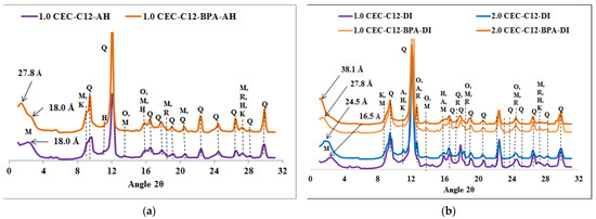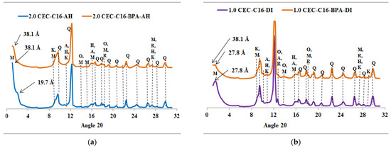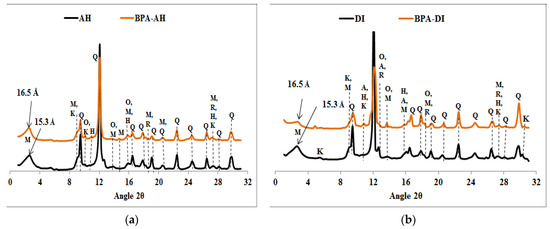 XRPD diffractograms of the natural raw clays and the organoclays before and after BPA sorption are shown in Figure 1, Figure 2, Figure 3, Figure 4 and Figure 5. The diffractograms of the AH and DI raw clays (Figure 1) show that they contain montmorillonite, kaolinite, quartz, orthoclase, hematite, and rutile, as well as anorthite in the DI clay [25]. Figure 1 shows that there is only a marginal increase in the d001 values of the Ca-montmorillonite of the natural raw clays (AH, DI) after treatment with an aqueous solution of BPA. The slight increase in d001 basal spacing, from 15.3 to 16.5 Å shows that only a few BPA molecules penetrated into the interlayer space of the natural raw clays, and may suggest sorption on the external surfaces of the clay, probably at the broken edges [27]. The slight increase of the d001 values sustained less adsorption efficiency of the raw clays towards BPA and this result is in agreement with the results obtained in our previous study by using a High-Performance Liquid Chromatography dosage of BPA [11].
