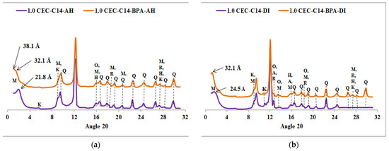 XRPD patterns of organoclays samples before and after BPA adsorption: (a) C14-AH, (b) C14-DI. Q = Quartz, M = Montmorillonite, K = Kaolinite, H = Hematite, R = Rutile, O = Orthoclase and A = Anorthite.
