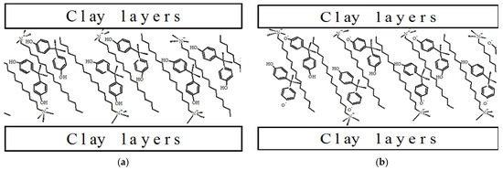 In our previous study [11], we reported that the amount of BPA sorbed on the investigated organoclays remained approximatively constant when 2 ≤ pH ≤ 8 (qe values ranged from 19.8 to 19.4 mg/g), decreased weakly when 8 ≤ pH ≤ 10 (qe values ranged from 19.6 to 16.6 mg/g), and decreased remarkably when pH > 10 (qe values ranged from 18.5 to 9.0 mg/g). The BPA molecules remain neutral as long as pH ≤ 8 and interacts with alkyl chains of the surfactants through van der Waals forces. However, at pH > 8 BPA starts to deprotonate and can interact with the alkylammonium ions of the surfactant located in the interlayer of the organosmectites. The possibility for a charged species to enter a principal neutral organic interlayer is generally hampered. The ion-dipole or coordination-type bonding is possible with a hydrophobic surface but would be greatly retarded by the strong competition from water in the case of raw clay having a hydrophilic surface. In this case, the BPA molecules act as an acceptor of electrons donated from sites of negative charge in the mineral clay surfaces [33]. A possible interaction mechanism is that hydrogens of the phenol groups in BPA bind to Si-O or Al-O groups in clay mineral surfaces. However, the absence of significant sorption of BPA by the raw clays indicates that such mechanism is of only minor importance if any at all. One would expect a largely reduced sorption of BPA at alkaline pH provided that hydrophobic interaction is the sole mechanism. However, the affinity of organoclays for anionic species is not changing significantly when increasing pH from 8 to 10, which shows that there is an additional chemical interaction between the surfactant and anionic BPA. As the BPA molecules become charged starting at pH 8, an additional electrostatic interaction seems to take place between the charged BPA and the tetraalkylammonium group of the surfactant molecules. Such interaction will further strengthen the interaction between the surfactants and the charged BPA molecules. Figure 6 shows surfactant molecules and BPA molecules arrangements/orientations into the interlayer space of the Ca-montmorillonite. The proposed arrangement is based on previous models by Dong et al. [17] on BPA sorption onto surfactant modified zeolites and Kamitori et al. [33] on the C12 alkyl chains and p-phenylphenol complex study. The increase of the d001 basal spacing sustains that the BPA molecules enter into the organoclays interlayers and Figure 6 represents the possible arrangement/orientation of the BPA neutral or mono-ionized molecules into the interlayers. The BPA molecules are sandwiched between the long alkyl chains (C12, C14, C16, and 2C12) of the surfactants and interact with them.