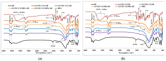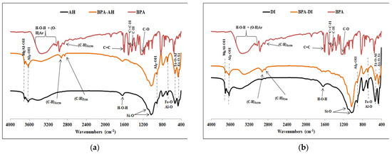 The infrared spectra of pure BPA and natural raw clays before and after sorption of BPA are shown in Figure 7 and those of pure BPA, and organoclays before and after BPA sorption are shown in Figure 8 and Figures S2–S4.