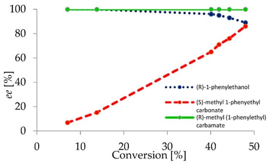 By combining enantioselective acyl transfer from model carbonates with acylation of chiral amine, a double enzymatic kinetic resolution was established. Model studies of the established process were performed on 1-phenylethyl amine (1o) and methyl 1-phenylethyl carbonate (2a). The optimization of reaction conditions revealed toluene at 50 °C to be most suitable and Novozym 435 (CALB) as the only efficient enzyme catalyzing reaction studied (Supplementary Materials, Tables S7–S9). To our great delight, (R)-methyl (1-phenylethyl) carbamate was obtained enantiospecifically, with a 45% yield of isolated product under optimized conditions. Moreover, (R)-1-phenylethanol was obtained with 90% ee and (S)-methyl 1-phenylethyl carbonate with 89% ee.