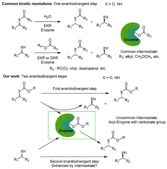 In the foundations of pharmaceutically-relevant molecules often lays a chiral, small-molecular scaffold, which is required to be in enantiopure form. Every stereoisomer of a drug candidate must be studied separately, for the biological activity and potential pharmaceutical application of opposite enantiomers may vary significantly. For instance, (R)-1-phenylethylamine is used for the synthesis of Etomidate (an intravenous anesthetic agent), [1] while a (S)-1-phenylethylamine substructure can be found in the (S)-Rivastigmine utilized in treatment of Alzheimer’s disease [2]. Thus, it is crucial to have access to both enantiomers of chiral compounds. Nevertheless, the predominant method of accessing enantiomerically pure compounds is the kinetic resolution (KR) of racemates promoted by enantioselective enzymes such as lipases, which are able to catalyze acyl transfer reactions [3,4,5,6,7]. To increase reaction yields, DKR (dynamic kinetic resolution) was developed; however, the product configuration is limited by the selectivity of the enzyme. Furthermore, the utilization of a metal-containing racemization catalyst may cause problems with final product contaminations. The classical KR utilized in industry and laboratory synthesis engages only half of the enzyme catalytic potential. Therefore, the full possible use of an enzyme is not obtained. The reactions catalyzed by lipases engage enantiomer differentiation in the first part of the catalytic cycle (KR by hydrolysis) [8] or the second (alcoholysis or aminolysis) [9]. Thus, reactions were enantio-differentiation takes place twice in the catalytic cycle are promising in enantioselective synthesis by KR. Such an approach can double the turnover number (TON) of the process, and increase the reaction yield and atom economy (Scheme 1).