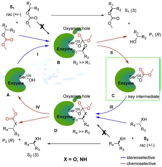 After scope limitation studies and a thorough analysis of the reaction outcomes, the impact of carbonate as an acyl donor on the reaction course was discussed. The proposed four-step catalytic cycle shows two chemoselective and two enantioselective steps (Scheme 3). The results of our studies indicated that the steps responsible for the binding of the acyl donor in the catalytic pocket (I) and alcohol release (II) have an enantioselectivity lower than the second step where the acyl group is transferred onto the amine (III). Thus, we presume that the binding of the C(=O)OCH3 group in the catalytic center is responsible for this enantioselectivity enhancement. Moreover, the enantioselectivity of C(=O)OCH3 moiety removal was enhanced by carbonate asymmetry, as shown by the results obtained for 1-hexyl methyl carbonate (2n). Thus, a clear impact of enzyme–carbonate acyl intermediate (C) on the reaction selectivity was demonstrated. During the first step, when the intermediate C is formed, its structure depends on the structure of the compound responsible for the nucleophilic attack in the third step. This was proven by the alcoholysis of the model carbonates with ethanol and methanol. In earlier works on carbonate double enantioselective reactions, an acyl–enzyme intermediate was formed selectively due to the irreversible tautomerization of vinyl alcohol. Thus, the more sterically-hindered intermediate was productive instead of the methyl/ethyl, which was not formed due to the utilization of vinyl-derived substrates. Thus, we proved that two types of intermediate can be formed in equilibrium driven processes. In the studied processes, only one form was productive, in contrast to chemically-catalyzed processes. The productivity of the intermediate depends not only on the enzyme selectivity, but also on the structure of nucleophile acting as an acyl acceptor in the second enantio-divergent reaction (III,IV).