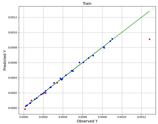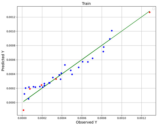 Given that all three models have good performance and that the R-square of all three is higher than 0.9, we had a hard time choosing the most general model. For this purpose, we pay attention to Figure 1, Figure 2 and Figure 3, in which the real (observation) values (green line) are displayed with the predicted values (blue in the training and red in the test). However, the points in the NU-SVR model seem to be further away from the actual data line compared to the other two models. But considering that in the other two models there is at least one red dot (test) with a very large distance, NU-SVR is the most general model. In other words, NU-SVR is considered as a better model because all the test points have shown an average prediction error, but in two other models, many of the points have shown errors near to zero, although in other points the error is huge. Table 4 compares the MAE, R2, and RMSE values of all developed models.
