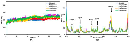 The best four compounds from the docking stage were proposed to predict their dynamic behavior to AR over 100 ns through MD simulation. The stability and flexibility assessment of the complex was analyzed based on the RMSD and RMSF criteria. The RMSD can be seen in Figure 2A, where all compounds were relatively stable during the 100 ns simulation with complex fluctuations below 0.3 nm. Minoxidil and the test compounds showed a similar fluctuation pattern. They did not differ significantly, with an average RMSD of 0.217 nm. Compounds 1 and 4 had the highest average fluctuations recorded at 0.223 and 0.226 nm. Minoxidil as a comparison and compound 2 had a similar average fluctuation slightly lower than the previous two compounds with a value of 0.216 nm. Interestingly, the RMSD pattern with the average fluctuation was given by compound 3 with a value of 0.206 nm. This stable pattern indicates that both the test and comparison ligand have the ability to stabilize the complex during the simulation.