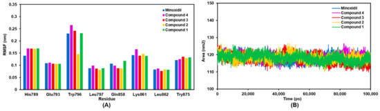 Solvent-accessible surface area (SASA) analysis was performed on each complex to complete the stability analysis (Figure 3B). An SASA plot displays the predicted areas on the receptor accessible to water molecules during the simulation. The smaller the area accessed by the water molecule, the more stable the ligand-receptor complex. The mean score of the SASA analysis was also calculated. The minoxidil-AR, 1-AR, 2-AR, and 4-AR complexes had the same area accessible by water molecules of 118 nm2. The smallest area is found in the 3-AR complex, with an access area of 117 nm2. This result aligns with the RMSD pattern, which shows that compound 3 has better stability than the other compounds.