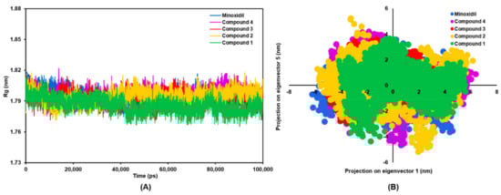 The plots of (A) radius of gyration of backbone atoms for AR-compound complex, and (B) principal component analysis of the projected trajectory in 2D, during 100 ns of simulation.