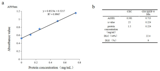 Loading capacity and efficiency of ZIF-8 NPs for CEC. (a) Standard curve for the Bradford protein assay. (b) DLC and DLE of CEC@ZIF-8 NPs.