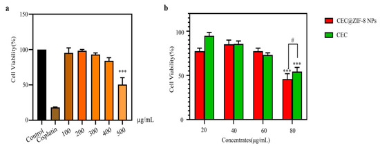 The cytotoxicity of ZIF-8 and CEC@ZIF-8 NPs against HeLa cells. (a) Minimal cytotoxicity of ZIF-8 NPs. Unloaded ZIF-8 NPs had little effect on HeLa cell number, suggesting good biocompatibility and safety as a drug nanocarrier. *** p < 0.001 vs. control group. (b) CEC@ZIF-8 incorporation of CEC into ZIF-8 NPs increases cancer cell toxicity. The cytotoxicity of CEC@ZIF-8 NPs against HeLa cells was significantly greater than that of free CEC at equivalent concentrations. Since CEC@ZIF-8 NPs have a 20% loading capacity, the maximum dosage of ZIF-8 NP corresponding to 500 μg/mL equates to CEC@ZIF-8 100 μg/mL. Data are presented as the mean ± SD from three independent tests. *** p < 0.001 compared to the 20 μg/mL treatment group. # p < 0.05 compared to the same concentration of CEC treatment group.