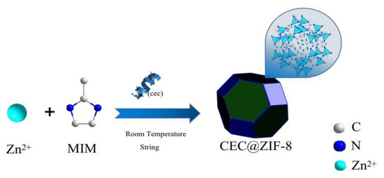 A 1.0 g sample of zinc nitrate hexahydrate dissolved in 10 mL deionized water and 20 g of 2-methylimidazole dissolved in 90 mL deionized water with 200 mg CEC were added together under stirring at room temperature to form a mixture with a zinc ion:2-methylimidazole:water molar ratio of 1:70:1653. The mixed solution turned milky white after stirring for 1 min, indicating that ZIF-8 crystals had begun to form. To ensure complete crystallization and improve the CEC loading, the reaction was continued for 5 min. Solids were then separated by centrifugation (14,000 rpm, 10 min), washed three times in deionized water, freeze-dried, and stored at −20 °C.