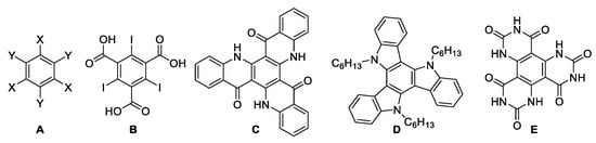 Generic structure of C3-symmetric benzenes (A), 2,4,6-triiodobenzene-1,3,5-tricarboxylic acid (B), [] two prominent C3h-symmetric disk-like structures triquinolonobenzene (TQB) (C) [] and 5,10,15-trihexyl-10,15-dihydro-5H-diindolo [3,2-a:3′,2′-c] carbazole (D); precursor dipyrimido [4,5-f:4′,5′-h] quinazoline-2,4,6,8,10,12-(1H,3H,5H,7H,-9H,11H)-hexone (E) [].