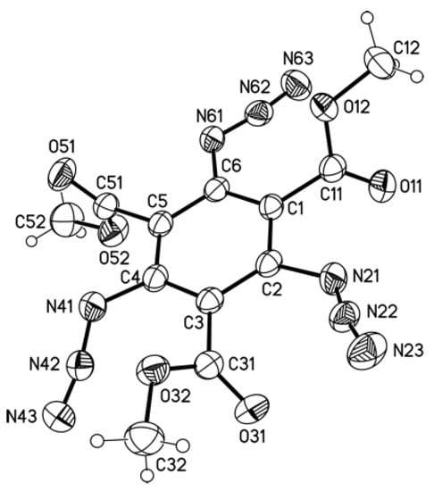 Herein, we report the syntheses of 1,3,5-triazidobenzenes, substituted with ester groups in a 2,4,6-position. The syntheses of triazides 3a–g proceeded from the triamines 2a–g under established conditions through a diazotization reaction. The triazides 3a–g were obtained in yields of 36% to 60% (Table 2). The yields that were achieved for the triazides 3a–g were in the range of other reported triazides that were synthesized from the corresponding amines [,]. A procedure in which the diazotization was carried out with tert-butyl nitrite and tosylic acid at 21 °C, followed by the addition of sodium azide, did not result in the formation of the triazide 3a. Triazides 3a–c and 3g were stable at normal conditions (daylight included) for several weeks. In the case of the alkyl triamino-benzene-tricarboxylates 2d, 2e and 2f, the mono- and diazides that were also formed during the conversion to the triazide could not be separated from the corresponding triazides via column chromatography. Therefore, these structures are not listed in Table 2.