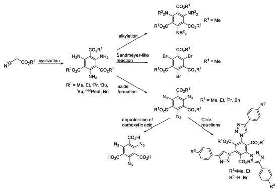 Herein, it is our intention to report the syntheses, structures and reactivities of novel C3-symmetric fully substituted benzenes with the tandem amino/alkylcarboxylate groups, based on the easily manageable cyclotrimerization of alkyl cyanoacetates. These electronically sophisticated structures of alkyl triamino-benzene-tricarboxylates led to extremely challenging subsequent reactions of the amine group. However, azide formation and a Sandmeyer-like reaction were studied within this report. Due to the low stability of triaminobenzenes, direct N-alkylation was rarely reported. Using the stable alkyl triamino-benzene-tricarboxylates allowed us total N-alkylation. An overview of the synthesized building blocks is given in Scheme 1.