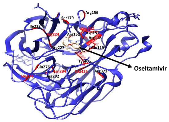 Neuraminidase proteins share common characteristic conserved residues within the active site region, which are directly connected to the sialic acid, such as Arg118 (R118), Asp 151 (D151), Arg152 (R152), Arg224 (R224), Glu276 (E276), Arg292 (R292), Arg371 (R371), Tyr406 (Y406) (Figure 2). Furthermore, other residues such as Glu119 (E119), Arg156 (R156), Trp178 (W178), Ser179 (S179), Asp198 (D198), Ile222 (I222), Glu227 (R227), His274 (H274), Glu227 (R227), Asn294 (N294), Glu425 (R425) are considered as binding cavity supporting enzyme frameworks [21,22]. Mutation of any of these conserved residues reduces the susceptibility of the influenza H7N9 virus to neuraminidase inhibitors [23]. Tang et al. (2019) also reported the reduction in the susceptibility of the H7N9 virus to NAIs. The study showed that the mutation of neuraminidase E119 to 119V or 119D resulted in a reduction in susceptibility to oseltamivir and zanamivir [24]. Mariana et al. (2006) had earlier reported infrequent detection of oseltamivir resistance in clinical trials with estimated frequencies of 0.4–1 percent (in adults) and 4–8 percent (in children) on and outpatient care basis [25,26]. Mariana et al. also reported oseltamivir-resistant cases that were 18 percent higher in a childrens’ hospital in Japan. The report further revealed that oseltamivir-resistant species contained substituted amino acid residues 119, 292, and 294 [26]. Prevalent resistance to the single treatment of the influenza H7N9 virus with these drugs led to the combination therapy of these drugs. In 2010, Donald et al. performed an experiment on the effects of the combination of oseltamivir and peramivir [27]. The study explored the chemotherapeutic impacts of the oseltamivir-peramivir combination on mice. A combination of oseltamivir and peramivir in a single dose were administered on some mice with the influenza virus for three days. The mice with combined therapy displayed a speedy and improved recovery compared with their counterparts. Further studies on combinatory treatments showed them to be a better treatment option for the influenza H7N9 virus [27]. Herein, we studied the interatomic and intermolecular dynamic impacts of the experimentally reported E119V mutation on the oseltamivir-resistant influenza H7N9 virus. We extensively carried out molecular dynamic (MD) simulations to investigate the binding mechanisms of oseltamivir-neuraminidase wildtype and E119V mutant complexes. We further analysed the post-MD trajectories to unravel the molecular basis of the E119V mutation as this could help in possible future influenza H7N9 virus drug development.