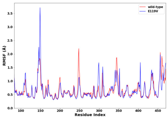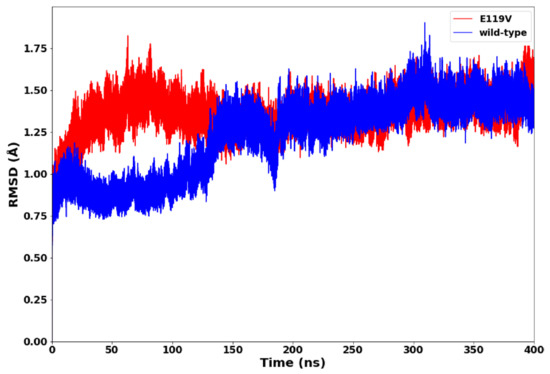 To analyse the conformational stability of wildtype and mutant proteins and compare their structural dynamic behaviour, the RMSD of backbone C-α atoms was calculated. This result could provide insights into the conformation of the protein throughout the simulation and the RMSD evolutionary trend of the protein. In Figure 3, we present the evaluation of the two systems’ root mean square deviation values. Both complexes demonstrated convergence after 200-ns of the simulation, with the wildtype possessing greater stability (average RMSD = 1.22 Å). In contrast, the high RMSD values in the mutant complex (average RMSD = 1.35 Å) suggested greater mobility of the backbone C-α atoms and less protein stability. Therefore, the E119V mutant complex exhibited a less stable structural conformation due to the mutation.