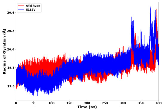 To further investigate the impact of the E119V mutation, the definition of secondary structure of protein analysis (DSSP analysis) [28] was applied to determine the protein secondary structural changes caused by the mutation. Coils, α-helix, turns, bends, and β-sheets were found in both wild and mutant proteins during simulation. However, the mutant protein showed a minimal decrease in bends forming residues after 160 ns compared to the wild protein (Figure 8). This conformational drift from bends to α-helix forms in the mutant protein after 160 ns within residues 140–160 was due to the amino acid substitution in the mutant structure, which might substantiate the observed less stable, more flexible, and less compact mutant structure.