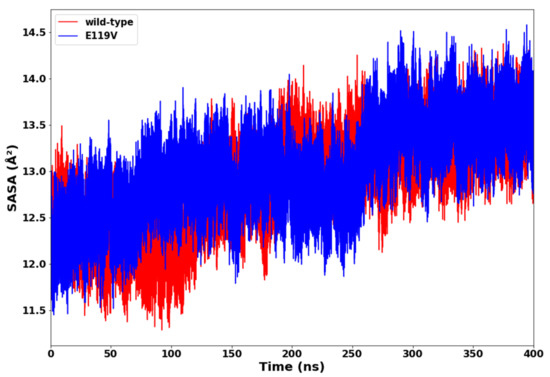 The surface properties of a protein largely determines the interactions between proteins and ligands. Hence, it is crucial to understand how structural deviations affect the solvent-accessible surface area (SASA). The SASA is the amount of surface area available to interact with other ligands, proteins, or solvents. Figure 6 shows the plot of SASA versus time for the wildtype and mutant complexes. The wildtype complex maintained a relatively lower SASA with an average value of 12,875.39 Å2, whereas the SASA values for the E119V mutant were relatively higher with an average value of 13,000.89 Å2 throughout the simulation. These results indicated that the mutant was thermodynamically unstable, and thereby exposed more proteins to water molecules. An E119V mutation, therefore, reduced the stability of the oseltamivir-mutant complex.