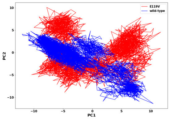 Collective motions of proteins are directly related to protein stability and, consequently, are associated with protein function. The principal component analysis provided insight into the overall collective motion of each protein atom in the biomolecular system. The first two principal components (PC1 and PC2) of each atom were computed and projected onto a two-dimensional (2D) subspace for the wildtype and mutant oseltamivir complexes (Figure 7). The E119V mutant structure was observed to cover more area and was more scattered, indicating an uncorrelated variation in dynamics of motion. Thus, the E119V mutant complexed structure displayed a more scattered type of collective motion than the wildtype complexed structure. Therefore, the higher flexibility in the mutant complex compared to the wildtype negatively affected oseltamivir binding interactions.