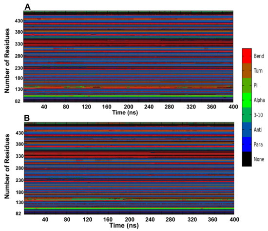 Alterations in the protein secondary structure for wild (A) and mutant (B) as a function of the 400 ns simulation time.