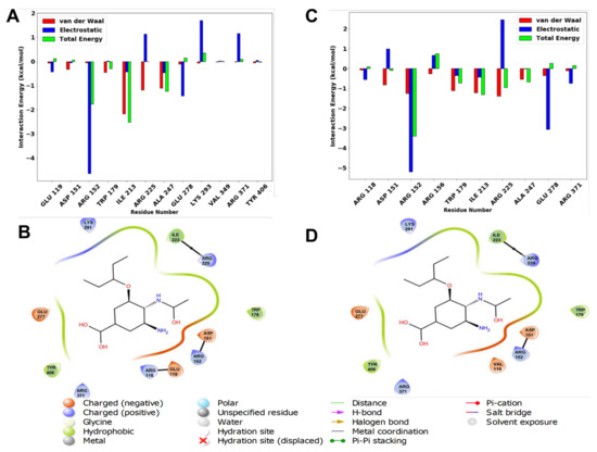 The per-residue energy decomposition analysis of oseltamivir-wildtype (A) and oseltamivir-E119V mutant (C) complexes, as well as residues interacting at the binding site (B,D), respectively.