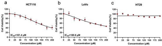 To investigate whether SsI has an anti-colon cancer effect, cell proliferation experiments were performed on colon cancer cell lines with mutant KRAS (HCT116 and LoVo) and wild-type KRAS (HT29) via CCK-8. As shown in Figure 1, SsI could inhibit the proliferation of HCT116 (IC50 = 161.4 μM) and LoVo (IC50 = 180.6 μM) with dose-dependence between the concentration of 0–200 μM. Meanwhile, there was no effect on HT29, as in previous studies [18,20]. The KRAS mutant colon cancer cells might be more sensitive to SsI.