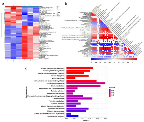 Since it had the lowest IC50, HCT116 was used to further experiment. Metabolomic analysis of HCT116 was performed to compare the metabolic differences after being treated with SsI. The SsI concentration of the treatment group was at approximately IC50 (160 mM) according to the result of the cell proliferation experiment. Multivariate statistical analysis by the OPLS-DA model demonstrated that each group was separated, which proved that the results were reliable (Figure S1). A total of 258 metabolites were identified by LC-MS/MS, of which 45 were defined as a differently accumulated metabolite (DAM) by p-value < 0.05, VIP > 1 (Table S1). The positive and negative values of Log2(FC) represented the up-regulation or down-regulation of DAM, and the absolute value represents the change degree. The top 20 DAMs by change degree are listed in Table 1. Compared with the control group, 29 DAMs were up-regulated and 16 DAMs were down-regulated (Figure 3a). The correlation between each DAM was analyzed by calculating the Pearson correlation coefficient between pairs of DAMs (Figure 3b).