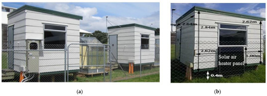 (a) The experimental test and control huts, located at the University of Auckland [22]. (b) The hut was supplied with a solar air heater panel [19].