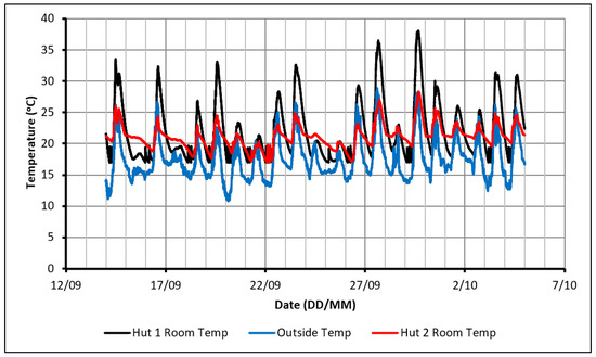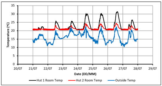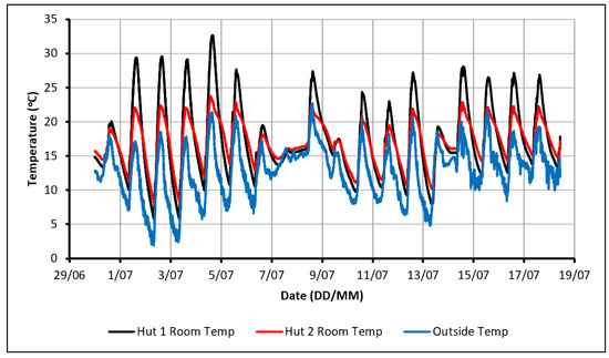 The initial experiment consisted of monitoring the temperature profiles within the huts over a range of weather conditions without supplying any external heat other than solar radiation. Although it was not expected that the PCM could make a significant impact on the comfort levels within Hut-2 without the use of some active heating, this experiment would provide a greater understanding of the behavior of the PCM in the experimental set-up, highlighting points and trends of interest for future experiments. The indoor and outdoor temperature profiles over 18 days can be seen in Figure 2 with the maximum and minimum outdoor temperatures experienced being 22.5 °C and 2 °C, respectively.