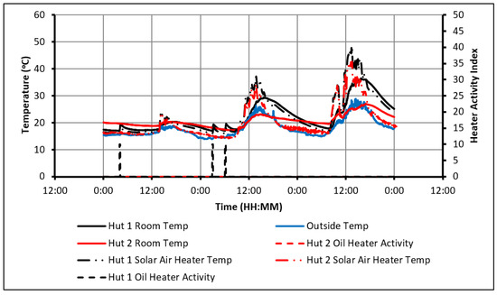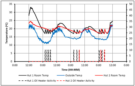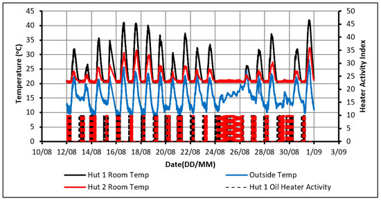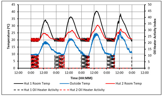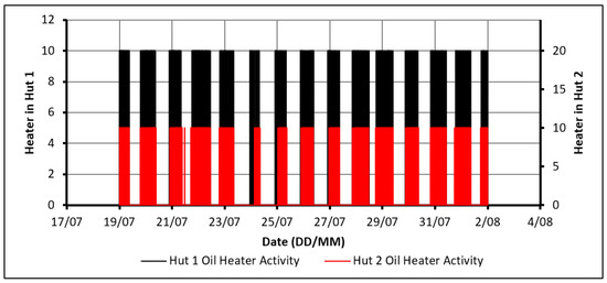 The activity of the heaters in both huts is displayed in Figure 4. An activity value of 10 shows that the heater was on, while 0 means it was off. From the detailed hourly data of this figure, it was determined that all the heating in both huts took place between the hours of 5:00 p.m. and 11:30 a.m. the next day.