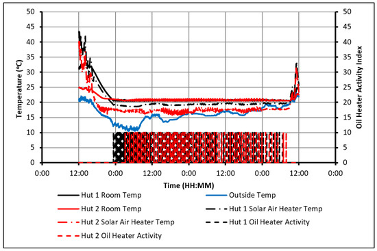 As seen in the previous figures, the heaters’ activity shows that the presence of the PCM delayed the cooling of Hut-2 to an extent that it hit the minimum temperature constraint significantly later than Hut-1. As a result, over the 20 full days, an overall energy saving of 33% was achieved in Hut-2. To illustrate how the energy is being saved, the 24 h starting from midday on day 8 are examined in Figure 8.