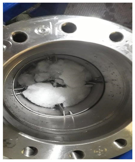 As it can be seen from Table 1, hydrate yield for all experiments is not big for two main reasons: firstly, because the total duration of experiments was only 3 h after hydrate formation, and secondly, due to the high quantity of water. In these experiments, the hydrate formation followed the hydrodynamic literature [20,21] about baffles and water quantity, this means that the height of water could be either equal to or 1.2 times the inside of the reactor’s diameter for single impellers, and 1.2–1.6 times for dual-impeller experiments. Figure 1 shows the amount of gas hydrate in the reactor for a single-impeller experiment with surface baffle.