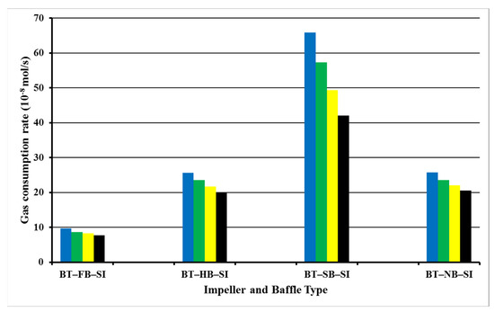 Analysis of the data of BT/BT dual-impeller experiments for induction time shows the same trend for single-impeller experiments (Figure 4). The shortest induction time is with full baffles (FB), 2 min. Then, induction times were not augmented in identical ways such as in single-impeller experiments. In dual-impeller experiments, the longer induction time takes place in the experiment with a surface baffle (SB). Therefore, the discussion made on the effect of baffle types on the induction time is different in systems with single, and in systems with dual impellers [24,25]. Figure 4 presents the hydrate formation rates of dual-impeller experiments obtained from the analysis of Figure 3 for 1 s, 600, 1200, and 1800 s, respectively.