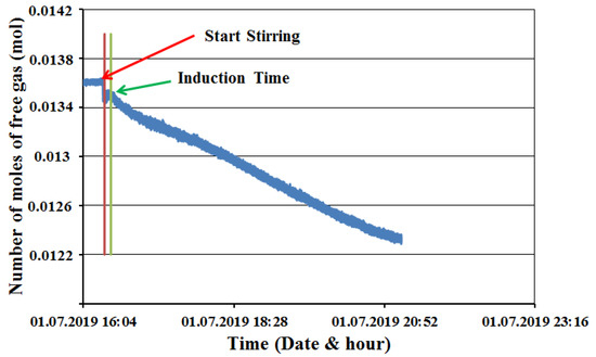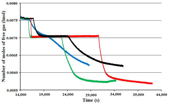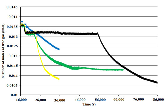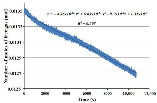 The data collected from our experimental process are pressure, temperature, and torque for every second. The gas compressibility factor of the real gas law Z was calculated using Lee and Kesler’s (1975) compressibility factor expression [32]. A sample plot of change in the free gas number of moles is shown in Figure 11 for CH4-SI-BT-FB.