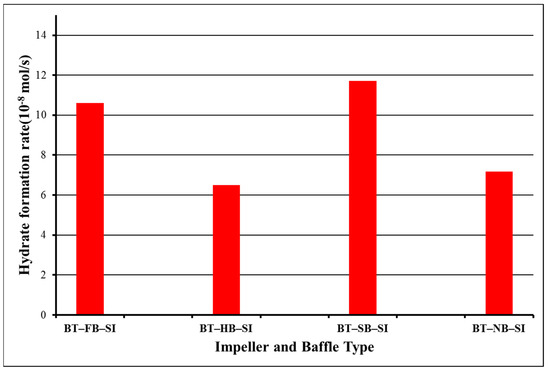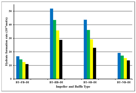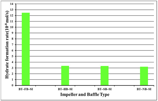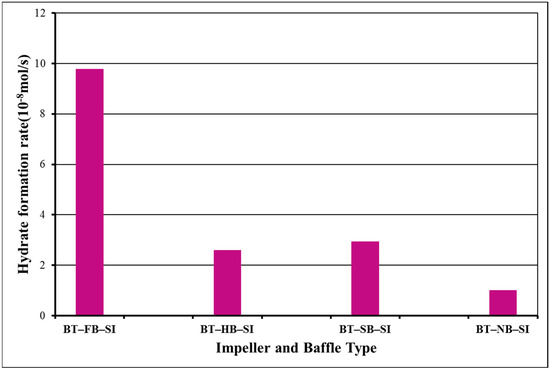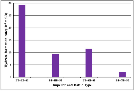 - In dual-impeller experiments, half baffle and then surface baffle had the highest values of rate of hydrate formation.