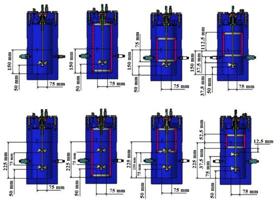A continuously stirred tank reactor (CSTR) with an internal volume of 5.7 L was designed (see Supplementary Material Figure S1) for our experimental process (see previous articles of Longinos and Parlaktuna for a thorough presentation of the experimental process). The dimensions of the rector, baffles, and impellers are all explained thoroughly below in Figure 10 (see Supplementary Material Figures S2 and S3). In Figure 10, the upper row from left to right shows: a single impeller with no baffle, a single impeller with full baffle (15 cm submerged in water), a single impeller with half baffle (7.5 cm submerged in water), and a single impeller with surface baffle (3.75 cm submerged in water). The space between the two impellers in the dual one was 7.5 cm. The height of the liquid was 15 cm in the single impeller and 22.5 cm in the dual impellers. The width of baffles was 1 cm while the internal diameter of a reactor was 15 cm (see Supplementary Material Figure S4). The sparger had a height of 1 cm and was used to bring the gas in such a way that bubbles were dispersed evenly. The bottom of the clearance (distance between the bottom of the reactor and impeller) was 5 cm [4].